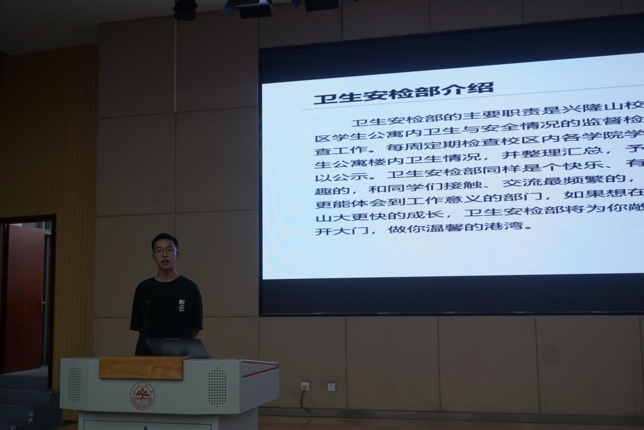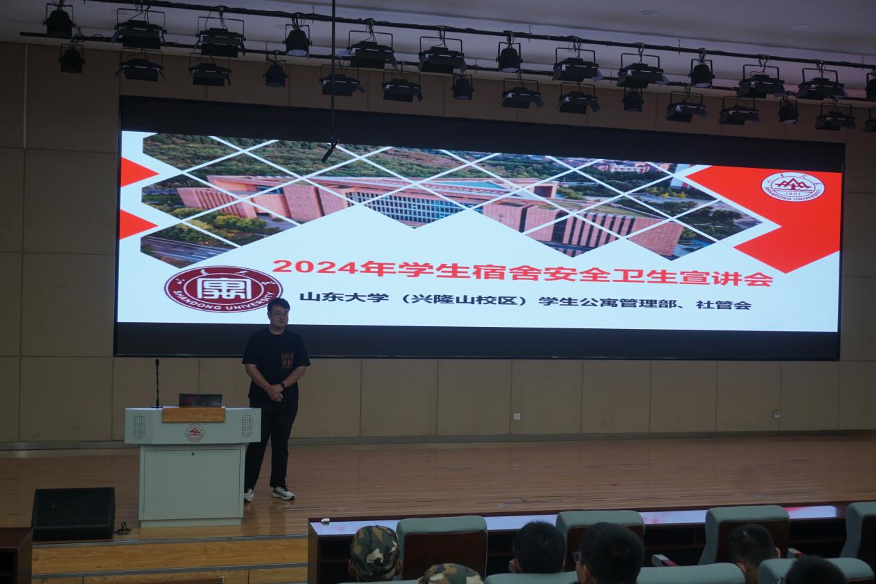 山东大学兴隆山校区学生公寓管理部、社管会进行学生宿舍安全卫生宣讲。秘书部副部长乔广正带领参会同学阅读了《山东大学学生公寓住宿守则》,向他们解释了其中较为重要的几条细则。乔广正讲解了宿舍常见问题的具体处理方法,介绍了社管会下设的三个部门的基本职能与能力要求,展示了部门活动剪影,向同学们保证各部门会继续加强服务、改善宿舍条件,保障同学们的生活权益。卫生安检部部长张烨垒详细介绍了卫生安检的检查流程和奖惩制度,列出常见违规电器,强调同学们不要怀有侥幸心理将违规电器带入宿舍。
