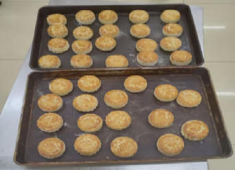 在经验丰富的甜点师傅的指导下,同学们把经过称量分装好的馅料揉成110g左右的馅料球,取出适量的面团将馅料进行包裹,像是为馅料球穿上了一层“黄金战衣”。在这个过程中,甜点师傅告诉同学们一个小技巧:尽可能少包一点面,这样才能做到皮薄馅大,好吃美味。最后一步,也是月饼的成形时刻,同学们通过将馅料球蘸裹面粉,放入模具挤压,制成了一个个印有山大标记的精美的五仁月饼,放入烤箱烘烤后,新鲜可口的月饼就制作完成了。
