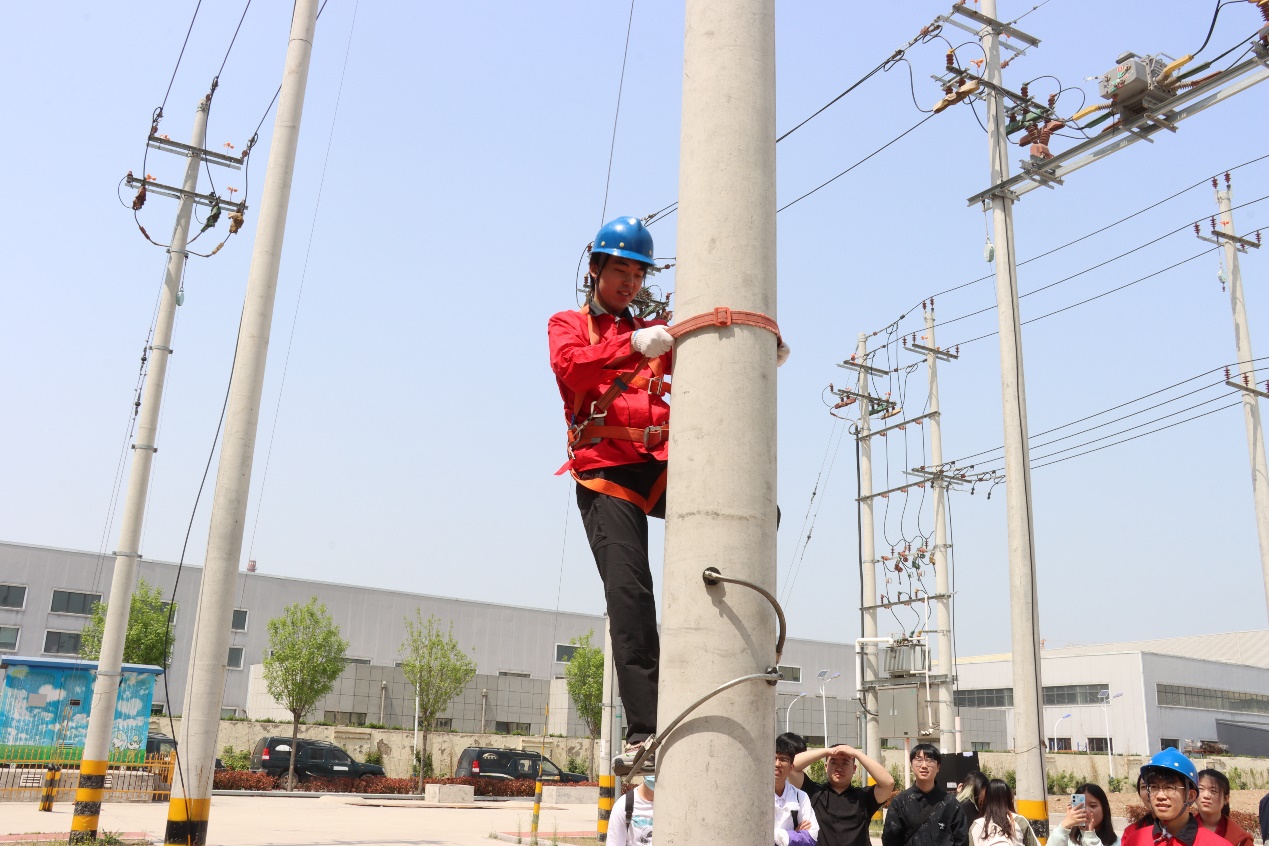 典礼在热烈的掌声中落下帷幕。随后,在梅格彤天工作人员的带领下,yl23411永利集团官网登录研究生实践团与学院领导、老师一同前往梅格彤天智慧产业园进行参观实践。在电力实训室中,结合工作人员对现场设备的讲解,实践团成员进一步学习了故障开关、配电能源互联网、馈线柜等相关知识,并进行了分合闸等实践操作。在登杆实践区,通过培训师的讲解培训,实践团成员掌握了登杆的要领,并顺利完成了自己电力生涯中的首次登杆实践。