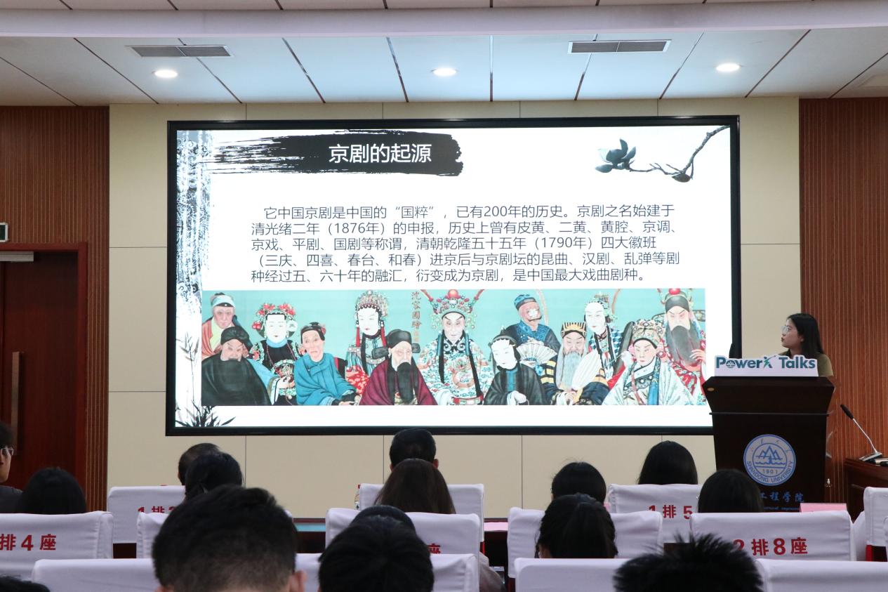 楚梦涵以“国粹京剧”为关键词,生动地介绍了京剧的起源和基本概况,并分享了她与京剧的故事。以《穆桂英挂帅》、《双阳公主》等经典京剧作品为例,楚梦涵用富有趣味的方式向大家展示了京剧的几类流派以及不同流派的特点和代表作,使同学们感受到了京剧唱腔、唱段、身段、武打等多方面的艺术之美。