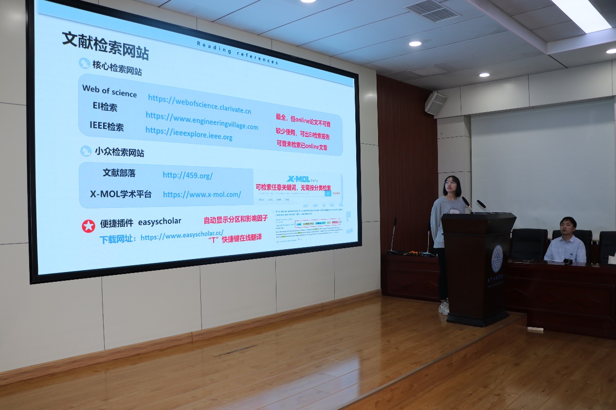 戴晓雯同学的分享围绕如何进行文献阅读、科研定位、论文撰写与投稿以及时间管理展开。她详细介绍了文献检索的实用工具,例如Web of Science、EI检索等,并强调了归纳整理的重要性,向同学们推荐了Zotero和OneNote等工具来高效管理文献。
